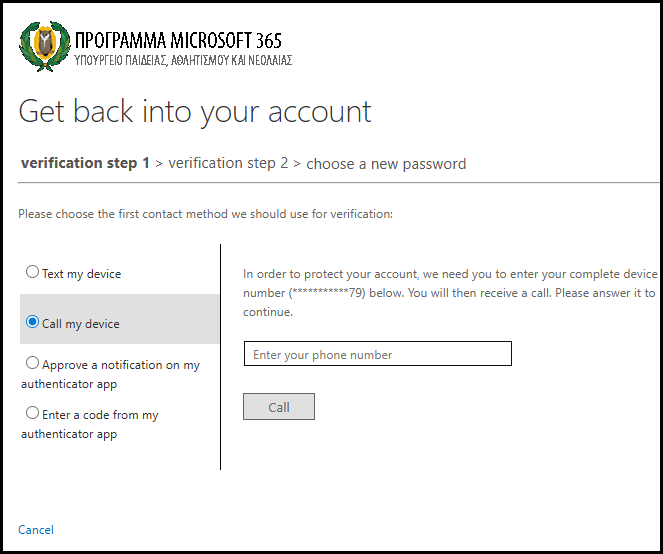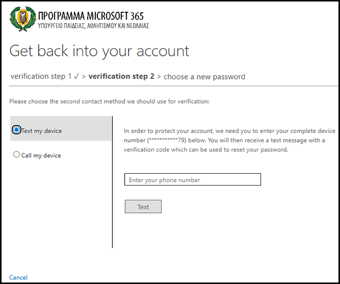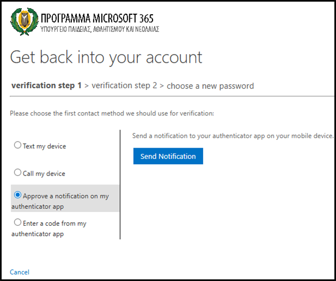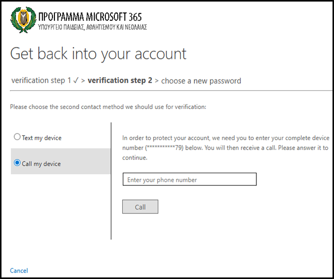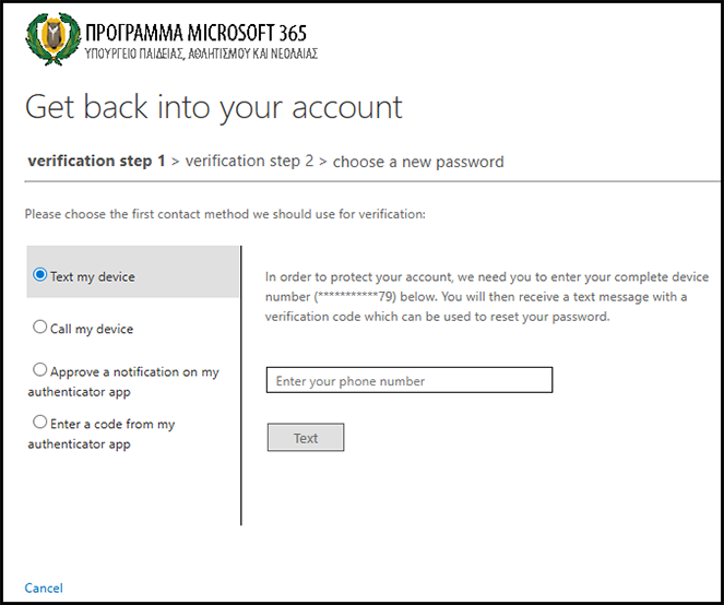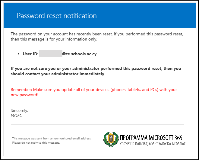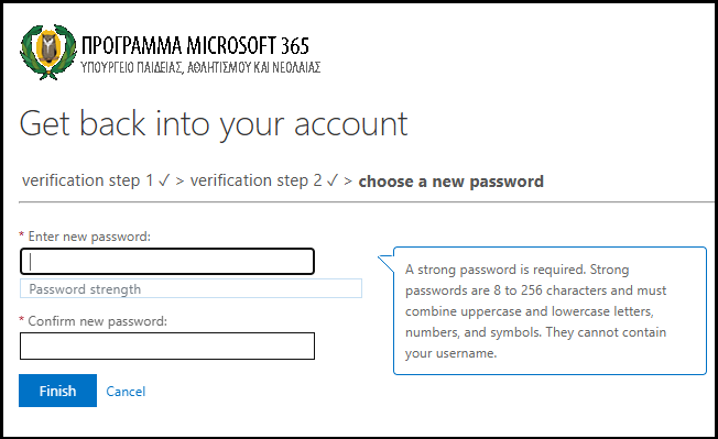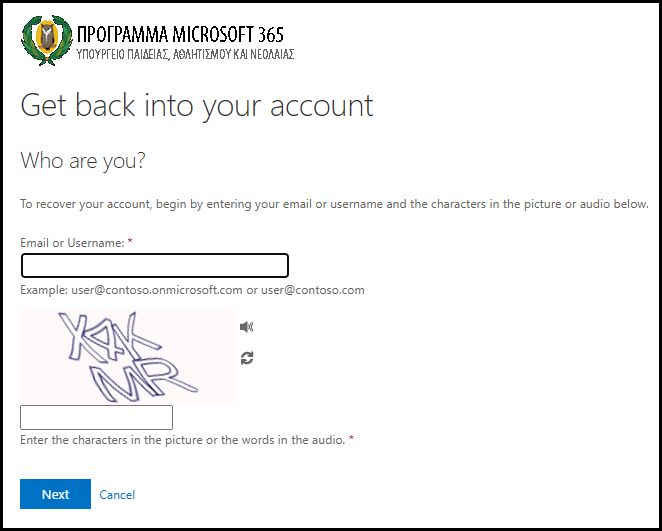 Σε περίπτωση που δεν ορίσατε διαδικασία ανάκτησης κωδικού, θα πρέπει να αποταθείτε στον υπεύθυνο του Microsoft 365, που έχει ορίσει το σχολείο σας, ή τη γραμματεία και να τους ενημερώσετε για το όνομα χρήστη σας. Στη συνέχεια ο υπεύθυνος Microsoft 365 ή η γραμματεία αποστέλλει μήνυμα στο Αυτή η διεύθυνση ηλεκτρονικού ταχυδρομείου προστατεύεται από τους αυτοματισμούς αποστολέων ανεπιθύμητων μηνυμάτων. Χρειάζεται να ενεργοποιήσετε τη JavaScript για να μπορέσετε να τη δείτε. μέσω του λογαριασμού ηλεκτρονικού ταχυδρομείου του σχολείου σας και ενημερώνει τους λειτουργούς για το όνομα χρήστη και την πρόθεση σας για ανάκτηση του κωδικού. Ο νέος προσωρινός κωδικός θα σταλεί στο επίσημο email του σχολείου σας και μπορείτε να ενημερωθείτε από την γραμματεία του σχολείου σας. Χρησιμοποιώντας τον κωδικό για πρώτη φορά θα σας ζητηθεί να τον αντικαταστήσετε με βάση τα πρότυπα που σας δόθηκαν στις οδηγίες.